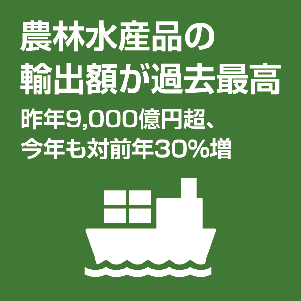 農水省、厚労省などの縦割りを解消し、認可手続きなど、輸出のハードルを改善。産地の支援も行い、新型コロナの中でも昨年の輸出額は9,000億円を超えて、過去8年で倍増。本年も対前年30%増。